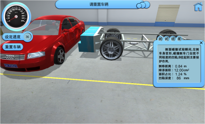 首先,实验首界面提供正面碰撞和侧面碰撞两种汽车碰撞方式选择;选择某一碰撞方式后,界面出现实验启发指导,启发用户思考;本实验提供不同间隔车速30-40、40-50、50-60、60-70、70-80、80-90、90-100的碰撞实验,每个车速启动碰撞可观察对应实验现象和实验结果,并在最后正面碰撞可生成后退距离-车速关系曲线、碎片面积-车速关系曲线、面积占比-车速系曲线、凹陷深度-车速关系曲线,侧面碰撞可生成侧移距离-车速关系曲线、掉漆面积-车速关系曲线、面积占比-车速关系曲线和凹陷深度-车速关系曲线。
